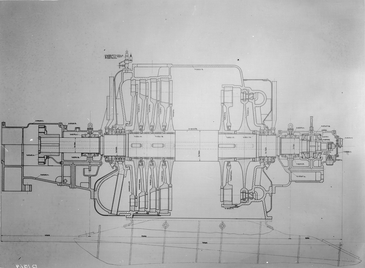 Konstruktionsritning på snitt av Jagarnas LT-turbin.