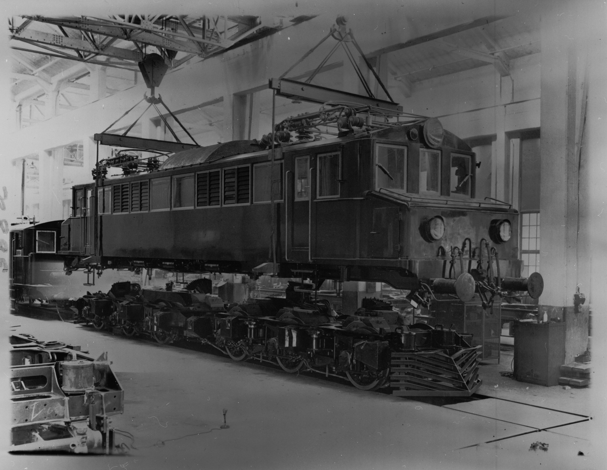 Ellok litt. M för Statens Järnvägar under montering: korgen "sättes på hjul".