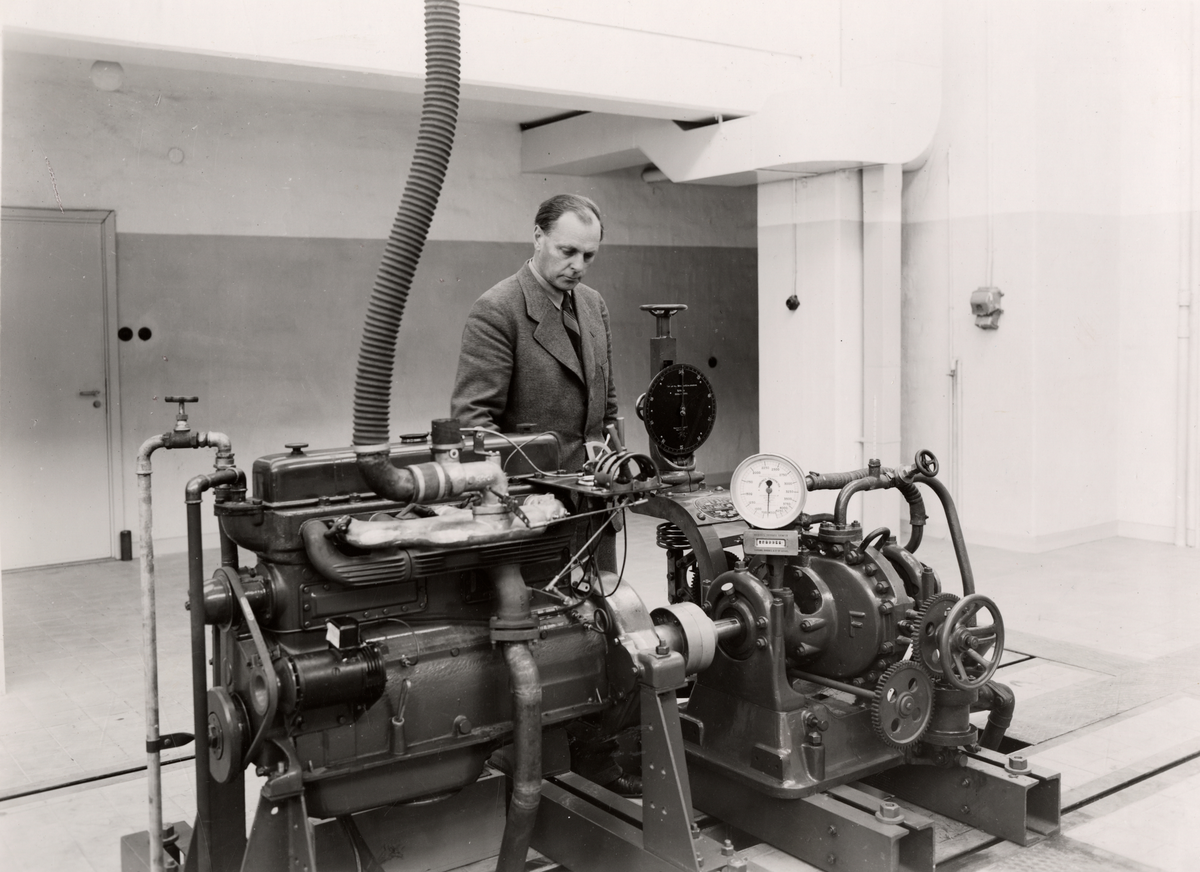 AB Gasgenerator i Örebro. Föreståndaren för provningsavdelningen, lektor Georg Nordberg, utför en av sina nogranna provningar tillhjälp av en provningsapparat. Vid fabriken finnes två stora provrum. Bilden visar det yttre av dem. Gasen kommer till motorn genom den grova slangen, som går ned från taket.