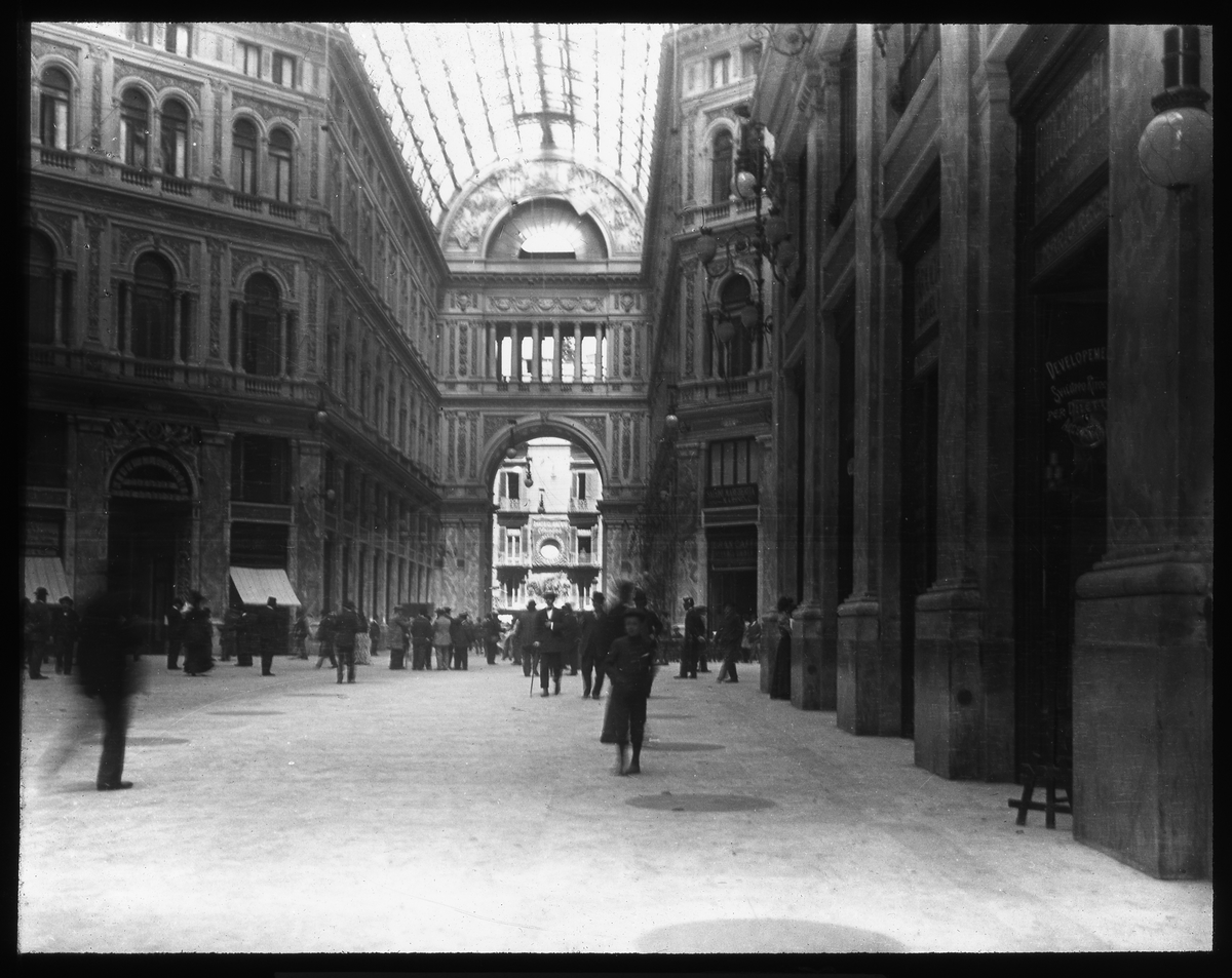 Skioptikonbild från institutionen för fotografi vid Kungliga Tekniska Högskolan. Motiv föreställande Galleria Umberto I i Neapel. Byggd mellan åren 1887-1891. Bilden är troligen tagen av John Hertzberg under en resa i Europa.