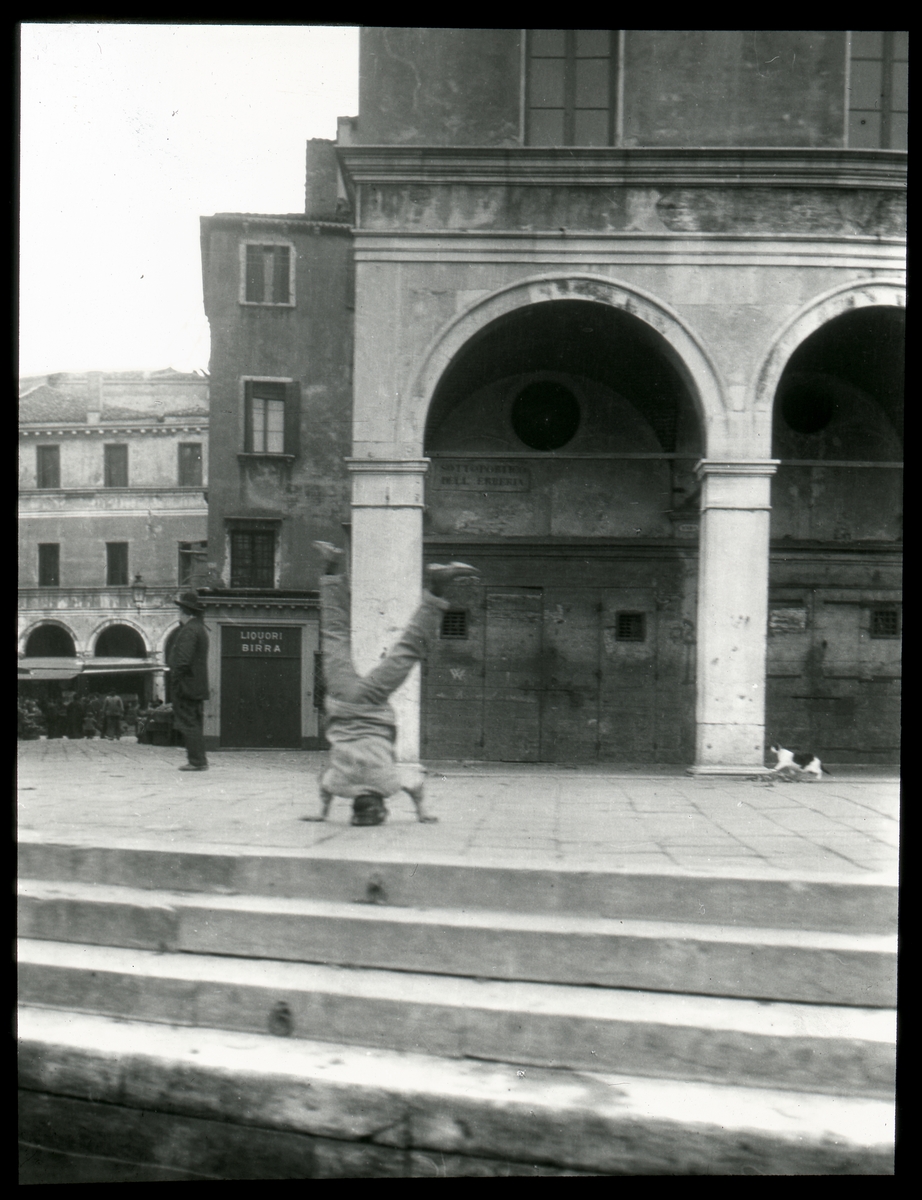 Skioptikonbild från institutionen för fotografi vid Kungliga Tekniska Högskolan. En man står på huvudet på öppen plats i Venedig. Bilden är troligen tagen av John Hertzberg under en resa i Europa.