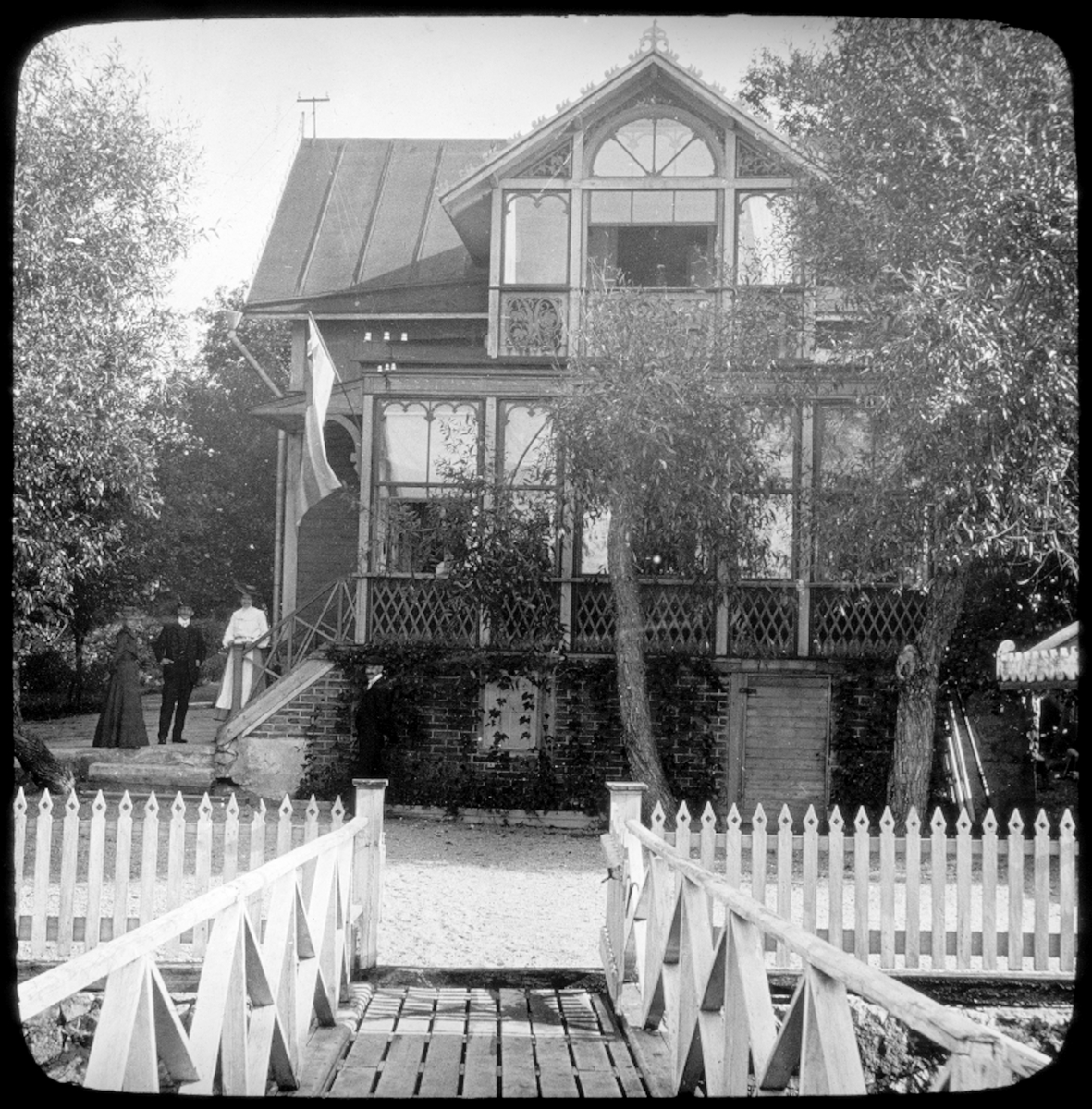 Skioptikonbild från institutionen för fotografi vid Kungliga Tekniska Högskolan. Motiv föreställande en villa. Bilden är troligen tagen av John Hertzberg under en resa i Sverige. OBS!(Bilden är ett ortokromatiskt negativ vilket gör att flaggans kors är mörkt).