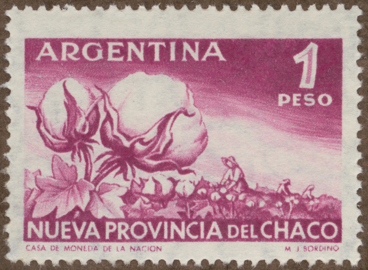 Frimärke från Argentina, 1958. Motiv av bomullsbuske och bomullsskörd i Chacoprovinsen, Argentina.