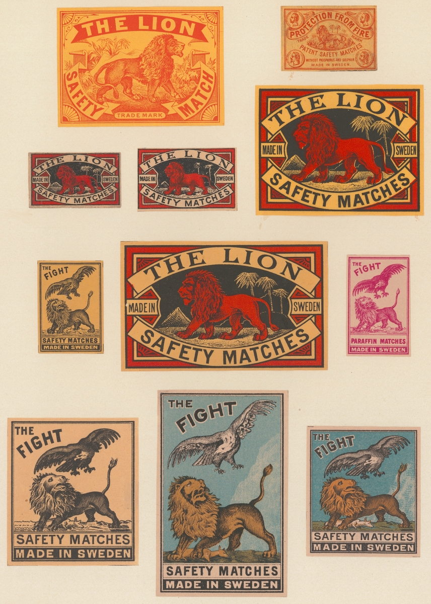 Etiketter för tändsticksaskar, från Svenskt Industri- och Handelsmuseum.