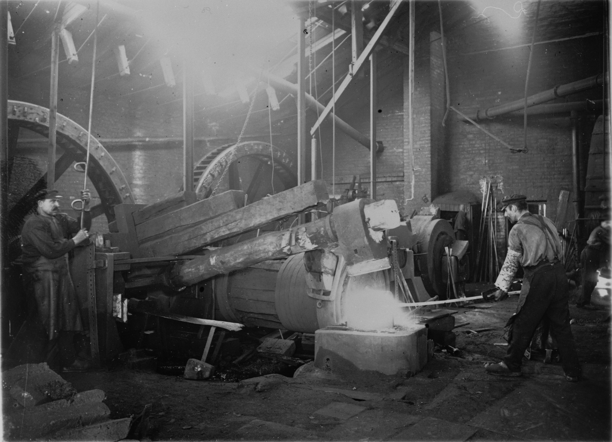 Hopslagning av smältan under vattenturbindriven skafthammare, Leufsta Bruk.