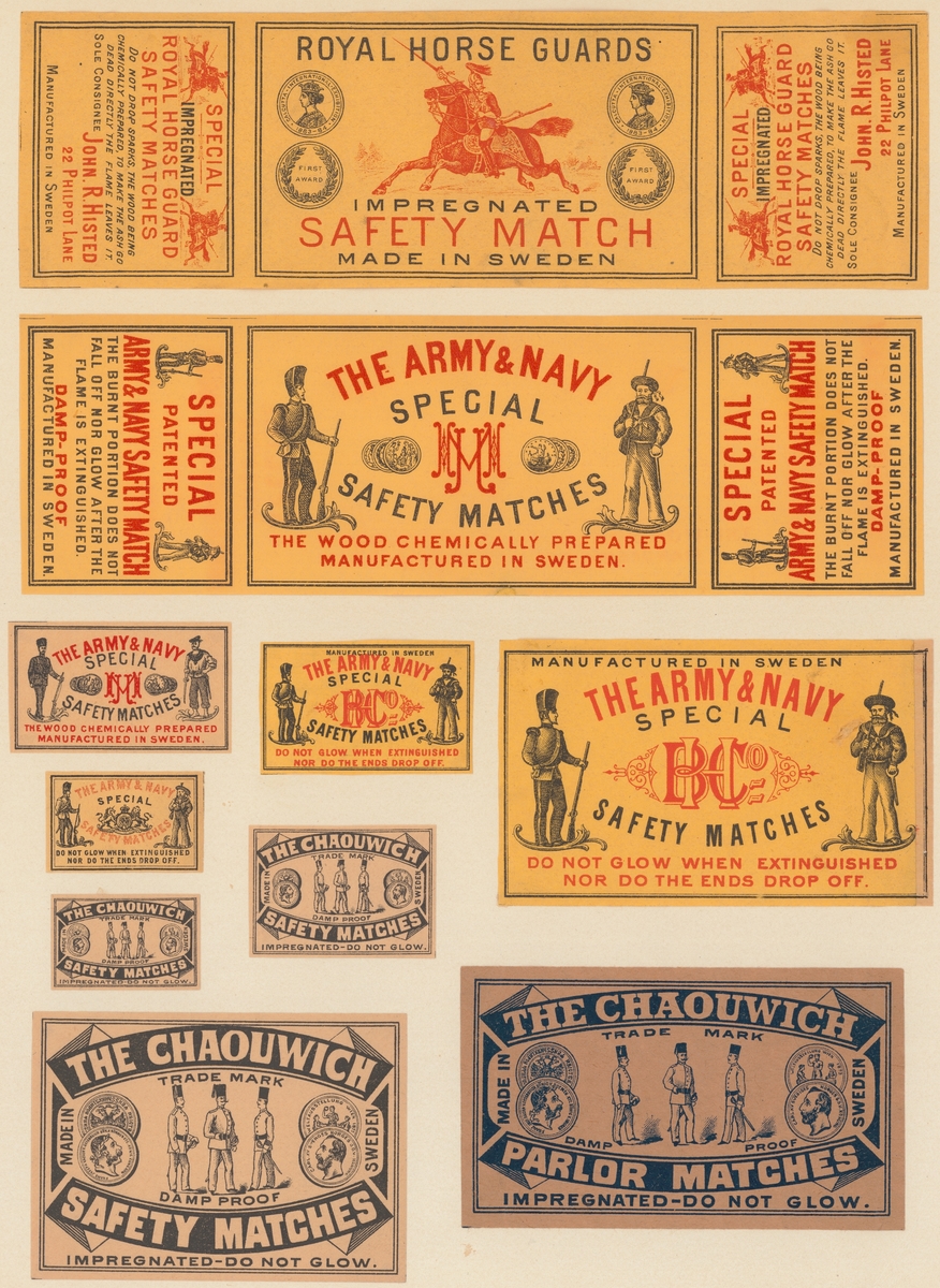 Etiketter för tändsticksaskar, från Svenskt Industri- och Handelsmuseum.