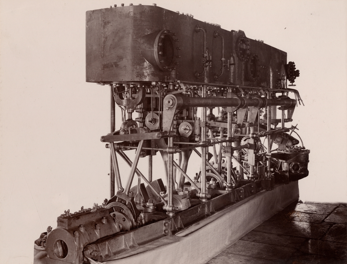 Titel: Propellerångmaskin om 3600 ind. hkr. för Jagaren Sigurd. Högtr.-cylinderns diam: 560 mm. Mellantr.-cylinderns diam: 750 mm. Lågtr.-cylinderns diam: 790 mm. Slaglängd: 480 mm. Tillverkad 1908.