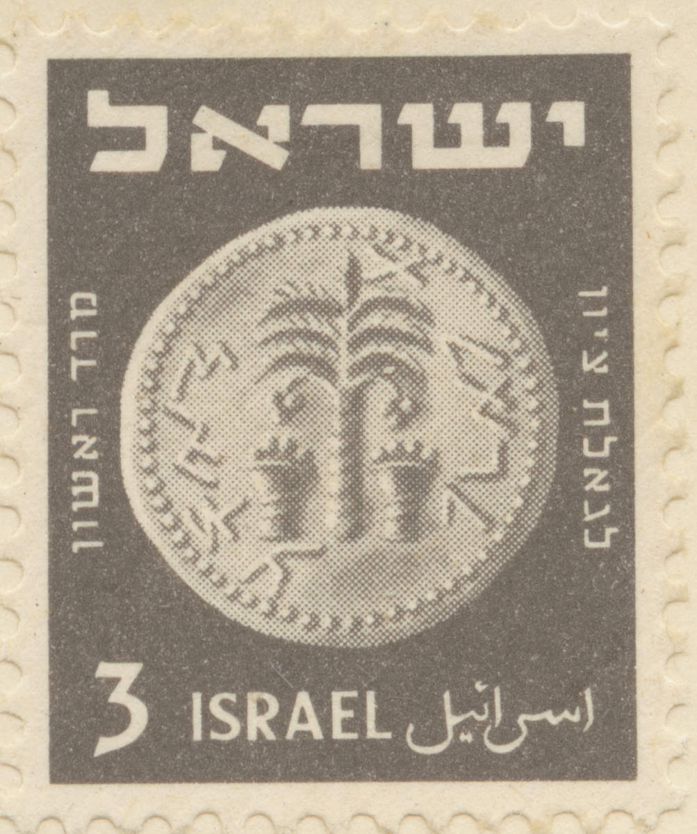 Frimärke från Israel, 1951. Motiv av symbol, träd och frukter: ornamentik på antikt hebreiskt mynt.
