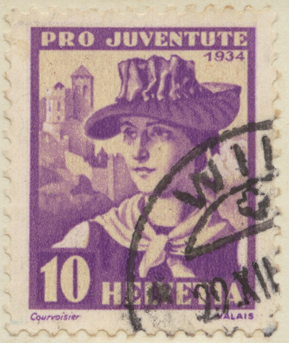 Frimärke från Schweiz, 1934. Motiv av kvinnodräkt, Wallis.
