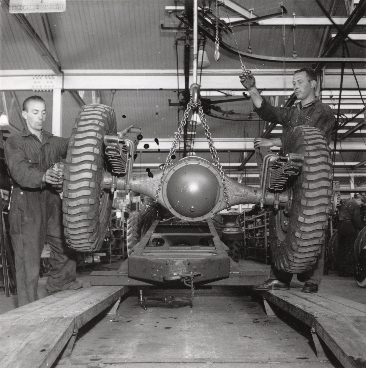 Sammansättningsbana vid Volvos fabrik i Göteborg. Ett fullt färdigt bakaxelparti för lastvagn lyftes fram till huvudbanan och monteras på ramen.