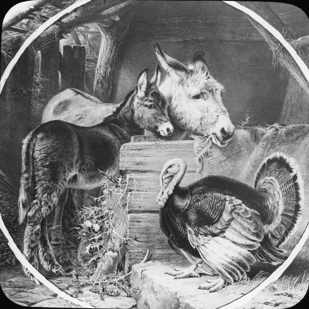 Skioptikonbild. Fotografi av konstverk. Bild av två åsnor och en kalkon.