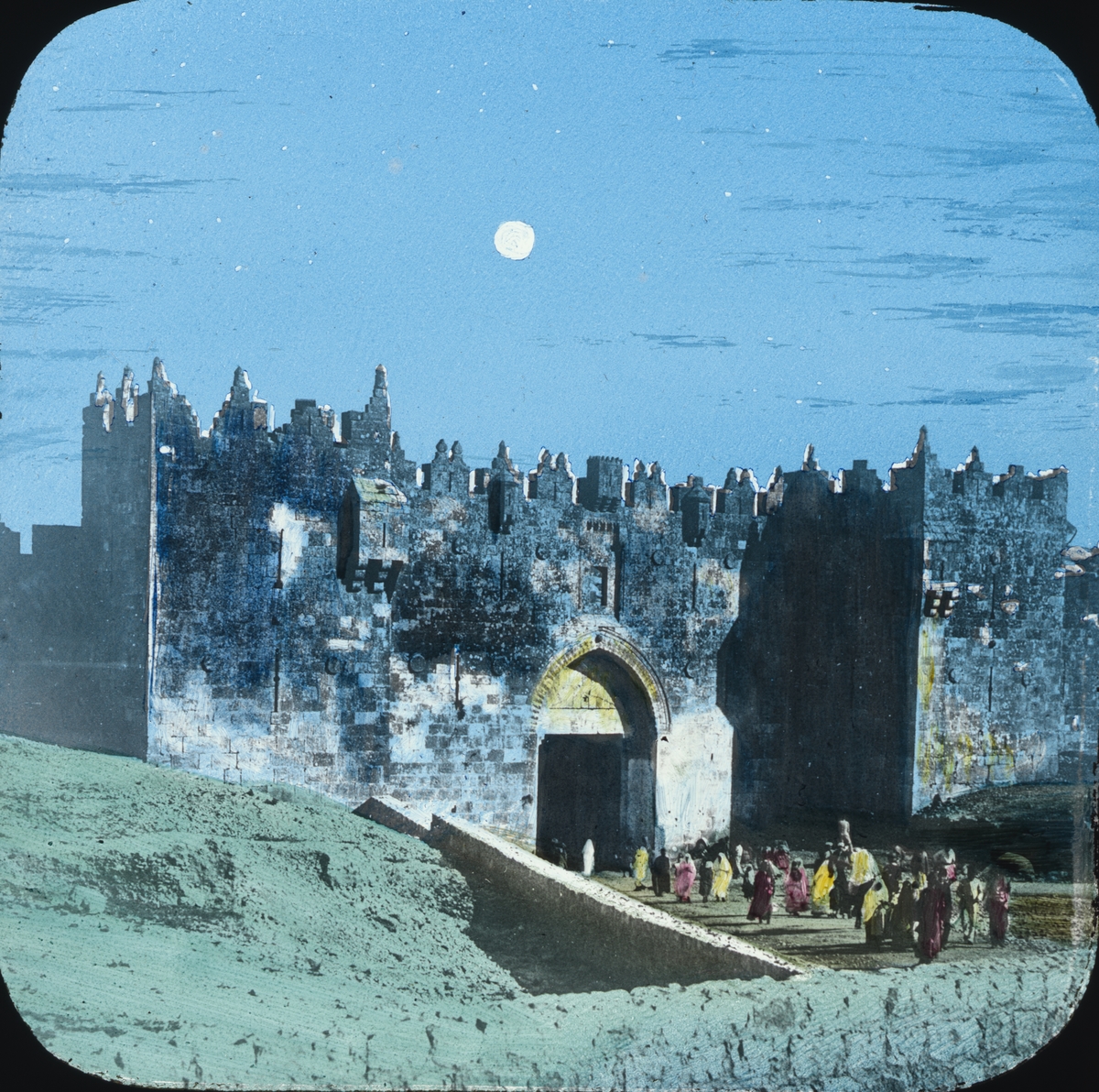 Kolorerad skioptikonbild med motiv av valvport in till okänd stad. Möjligen har bilden ett religiöst tema. Möjligen är det Nazareth.