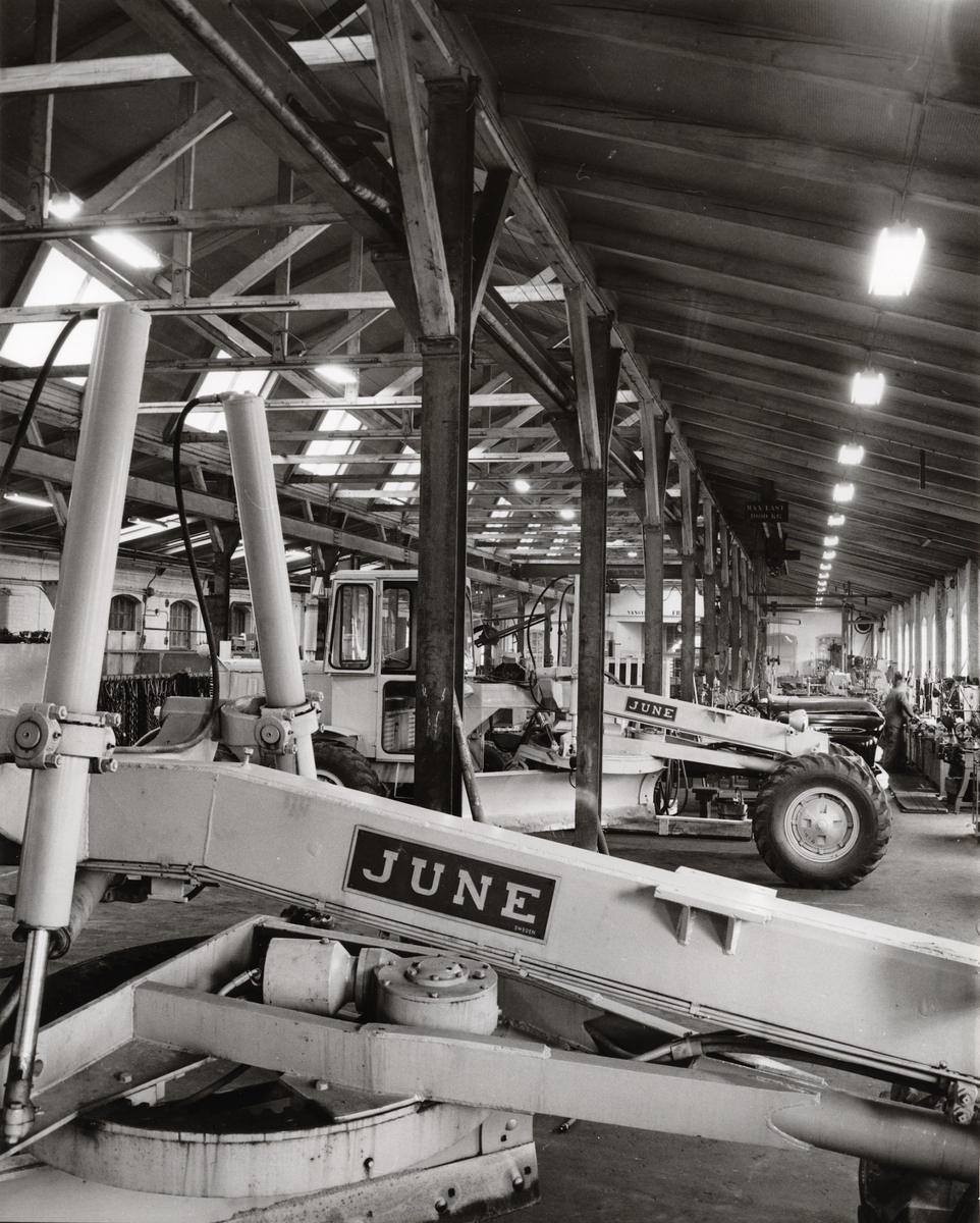 Jönköpings Mek. Werkstad, interiör. Väghyvlar i montagehallen vid June-verken. June väghyvlar var först med helt hydraulisk manövrering, vilket gör hanteringen smidig och lätt för föraren.