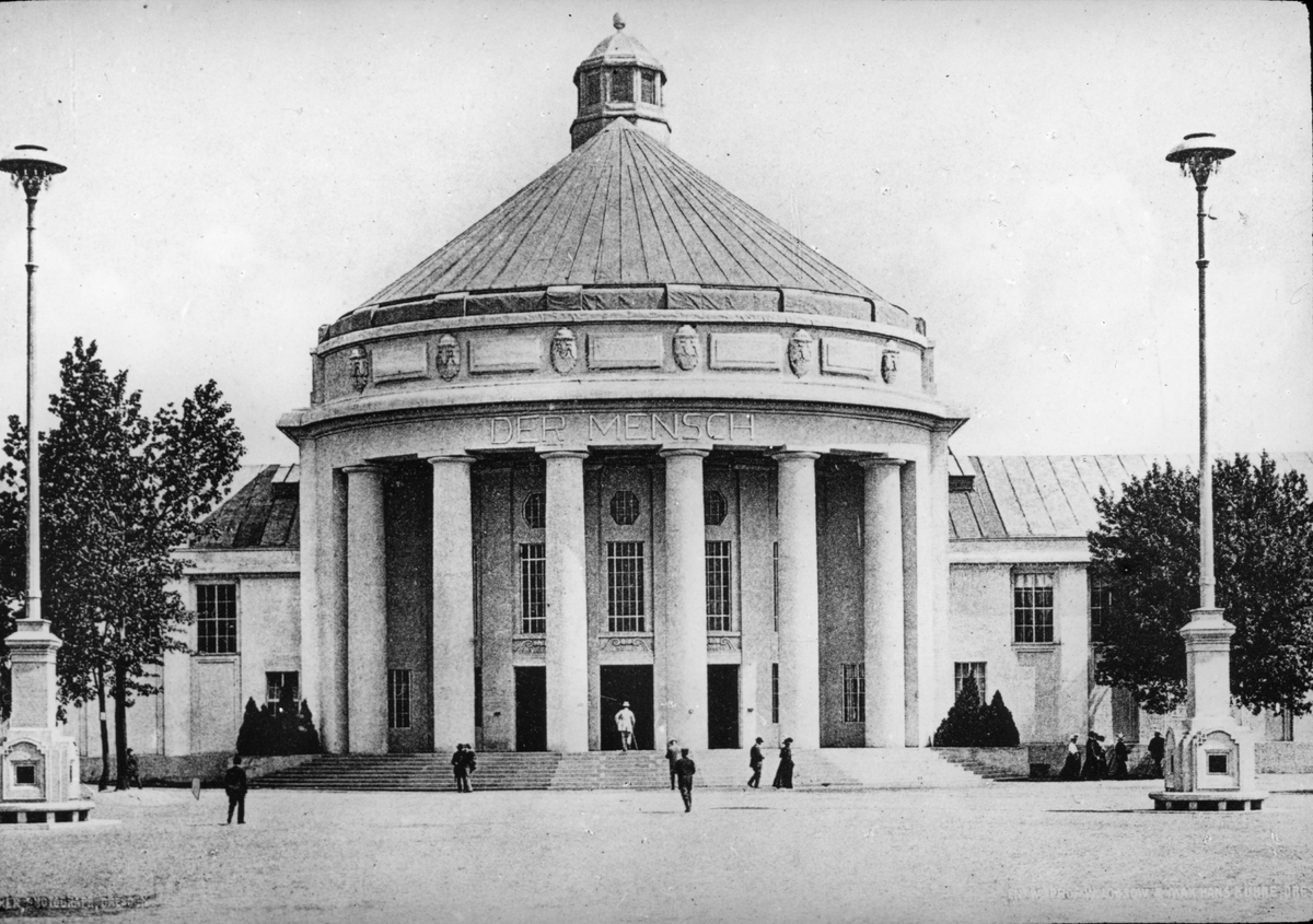 Skioptikonbild med motiv från yrkesinspektionens undersökningar på olika arbetsplatser. Internationella hygienutställningen 1911 i Dresden. Centrala utställningshallen "Der Mensch".
