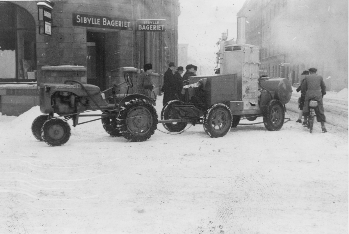Stockholms stads upptiningsmaskin för frusna rännstensbrunnar. Ångpanna på hjul bogseras av traktor och kan snabbt transporteras till arbetsplatsen.