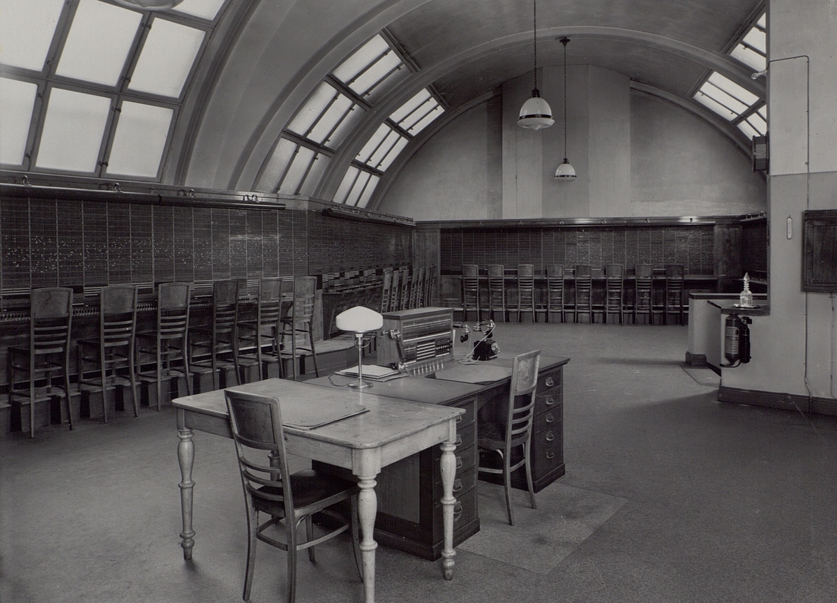 Karlaplan 2. Rikstelefons östermalmsstation. Manuell station, raserad 1933. Interiör från övre telefonsalen.