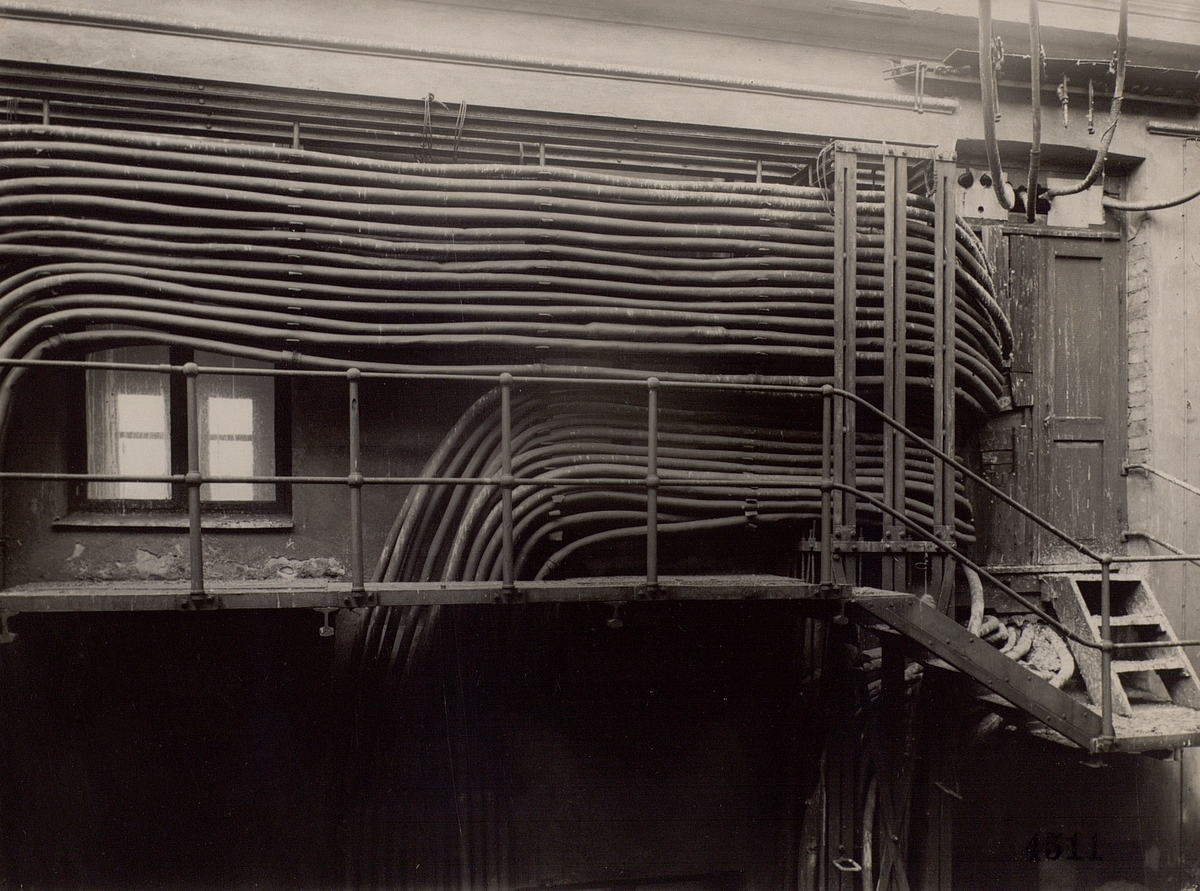 Skeppsbron 2. Kabelintag till överkopplingen. Telefonstationen Skeppsbron 2 "Centralen" var i drift till år 1929, då den automatiserades och flyttades till Jakobsbergsgatan 24.