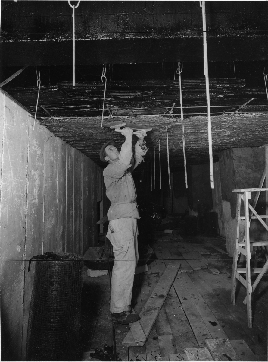 Utförande av takisolering med monierputs hängande i 6 mm rungjärn under betongbjälklag. På bilden syns även hängjärn för glidbanor i korridorerna.