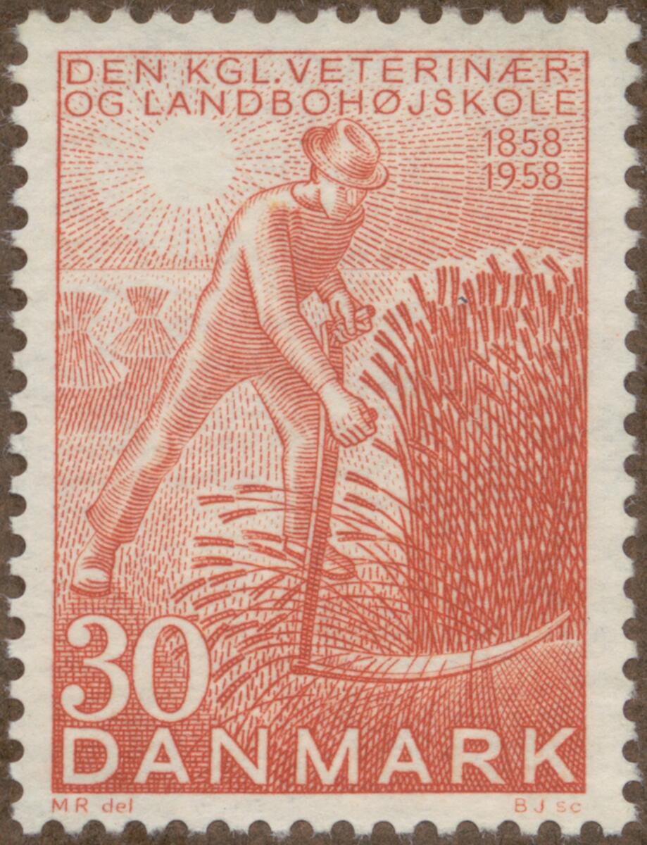 Frimärke från Danmark, 1958. Motiv av man skördande med lie 100-årsminne "Den kgl. Veterinär og Landbohöjskole" 1858-1958.