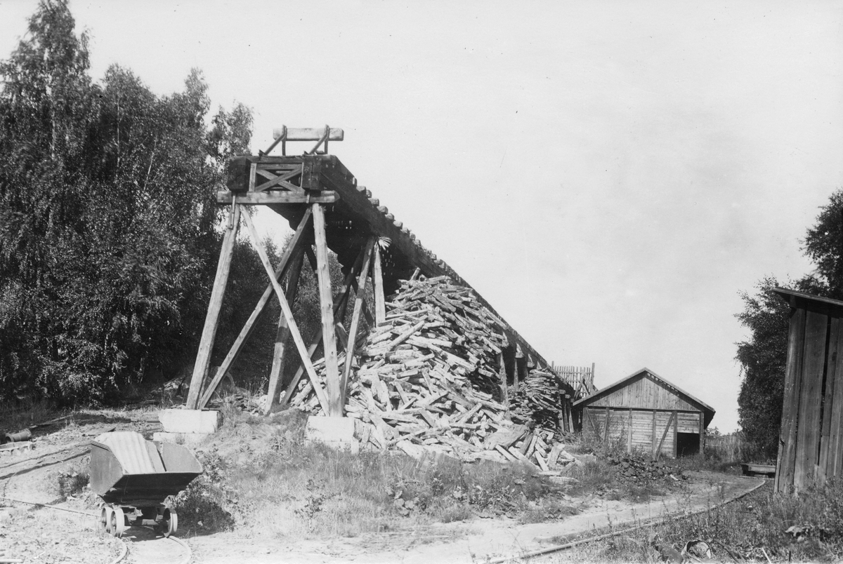 Malmtippen. Till höger skymtar sandbåset för gjuterisand. På marken ligger en hög med engelskt tackjärn för gjutgods.