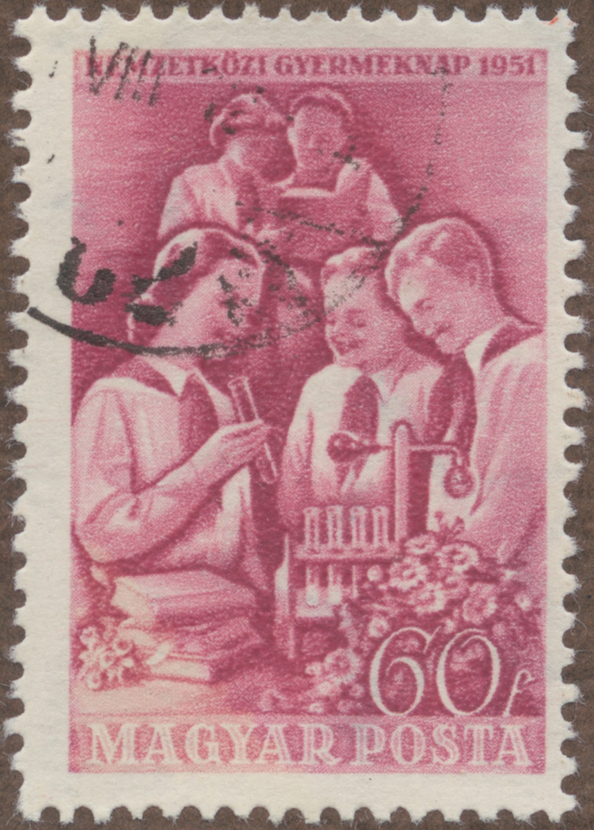 Frimärke från Ungern, 1951. Motiv av Tonåringar med provrör -Internationell barndag-