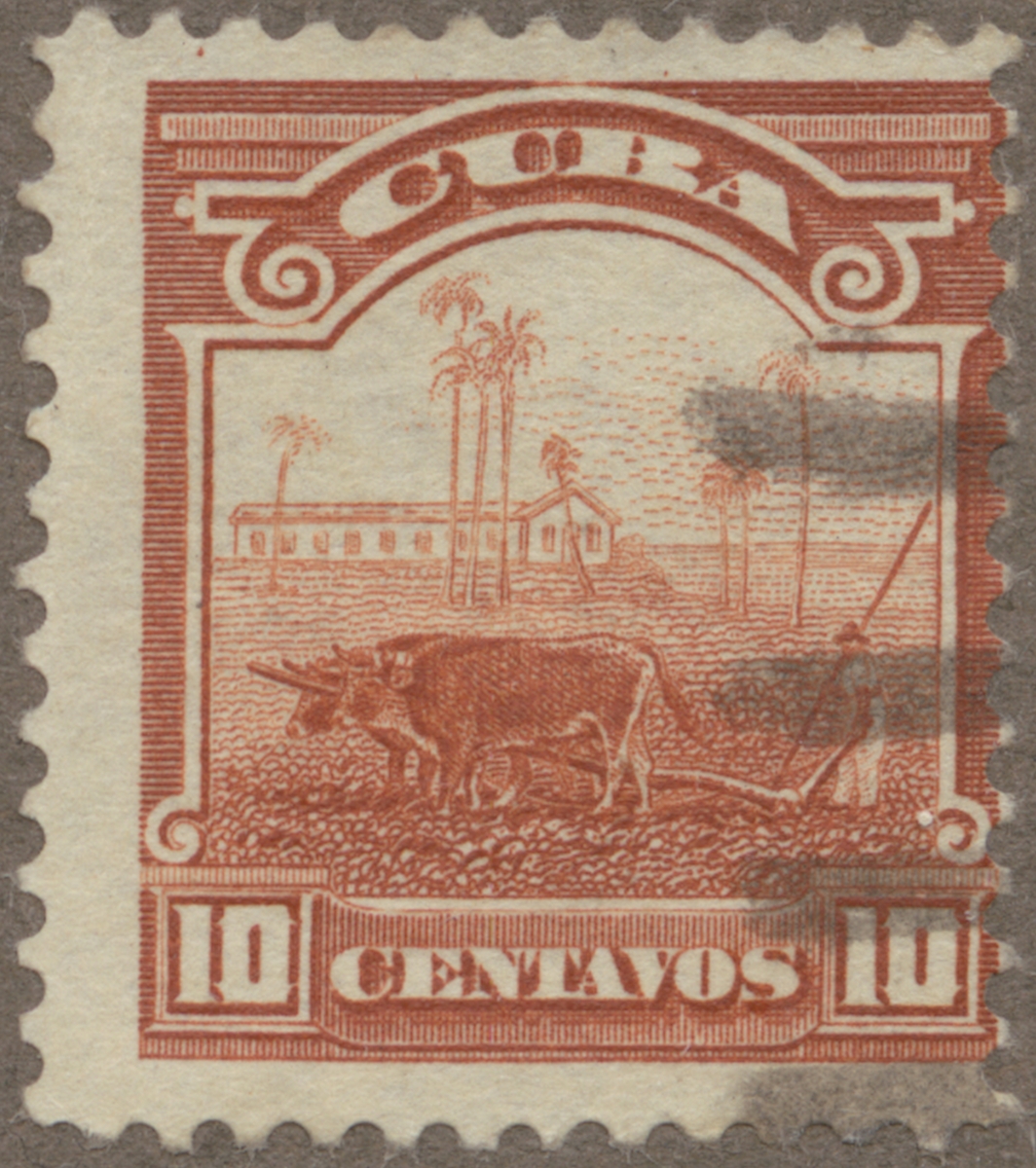 Frimärke från Cuba, 1899, Motiv av Primitivt lantbruk på Cuba. Plöjning med oxar som dragare.