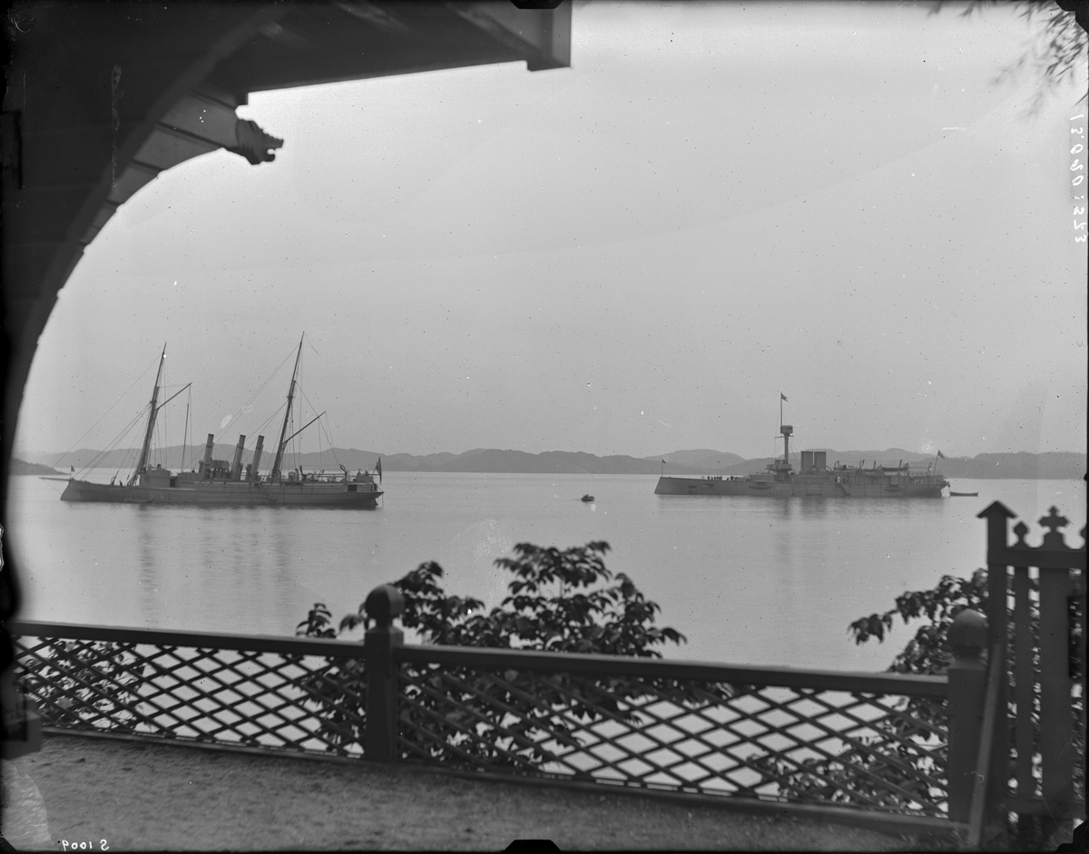 Pansarbåten "Svea" och en kanonbåt. 1800-talets slut. Sett från Curmans villa, Lysekil.