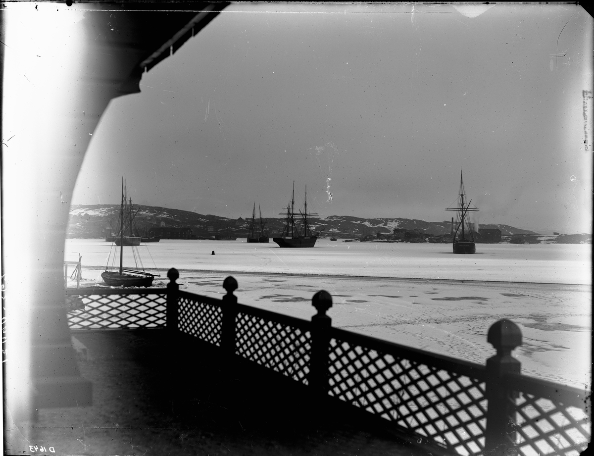 Fartyg i hamn. Vintertid. Vy från Curmans villa i Lysekil.