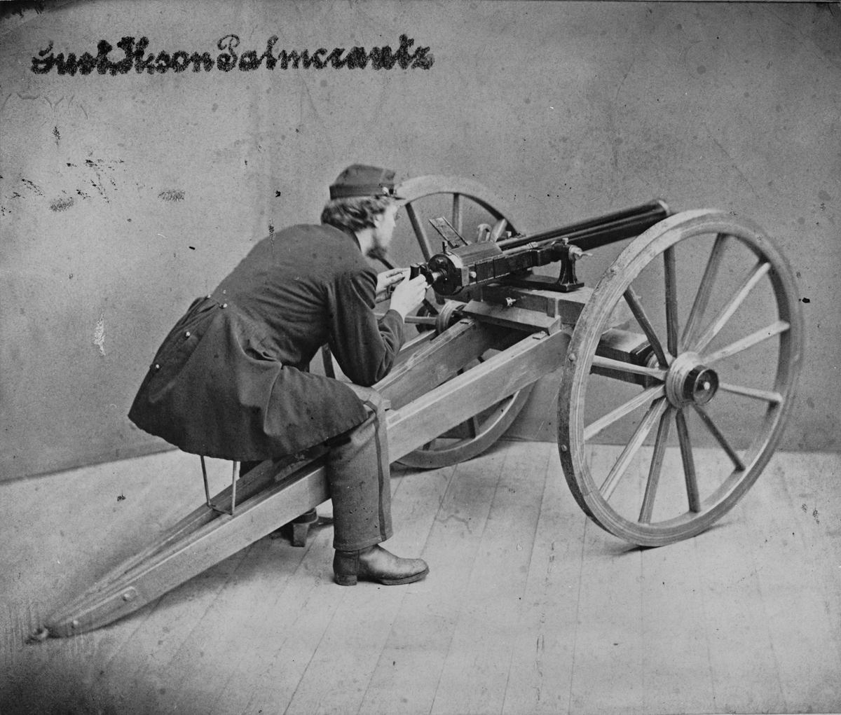 Man i kanonskytteuniform vid Palmcrantz kulspruta.