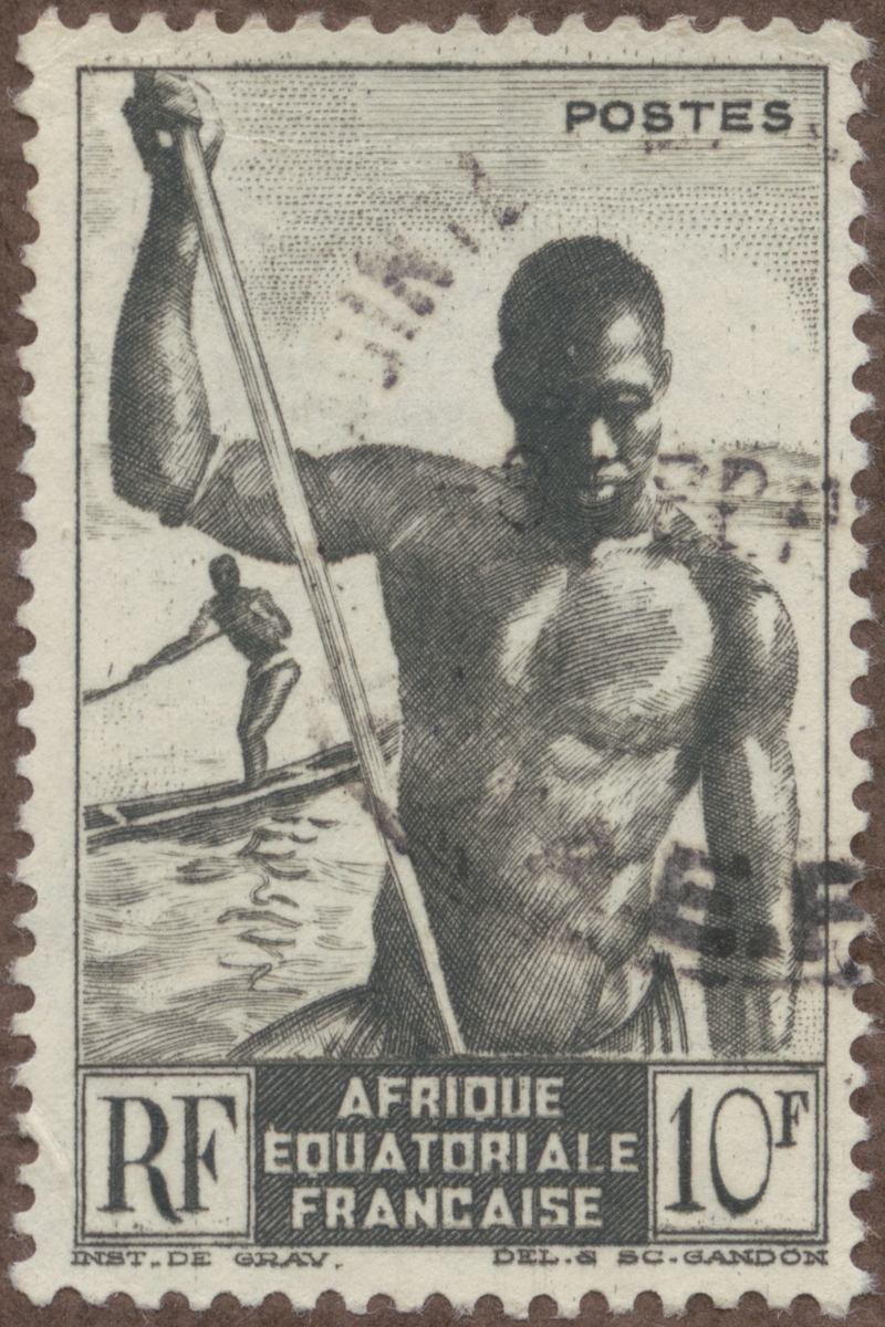 Frimärke från Franska Ekvatorial Afrika, 1947. Motiv av Fiskande med spjut i Nigerfloden- Afrika