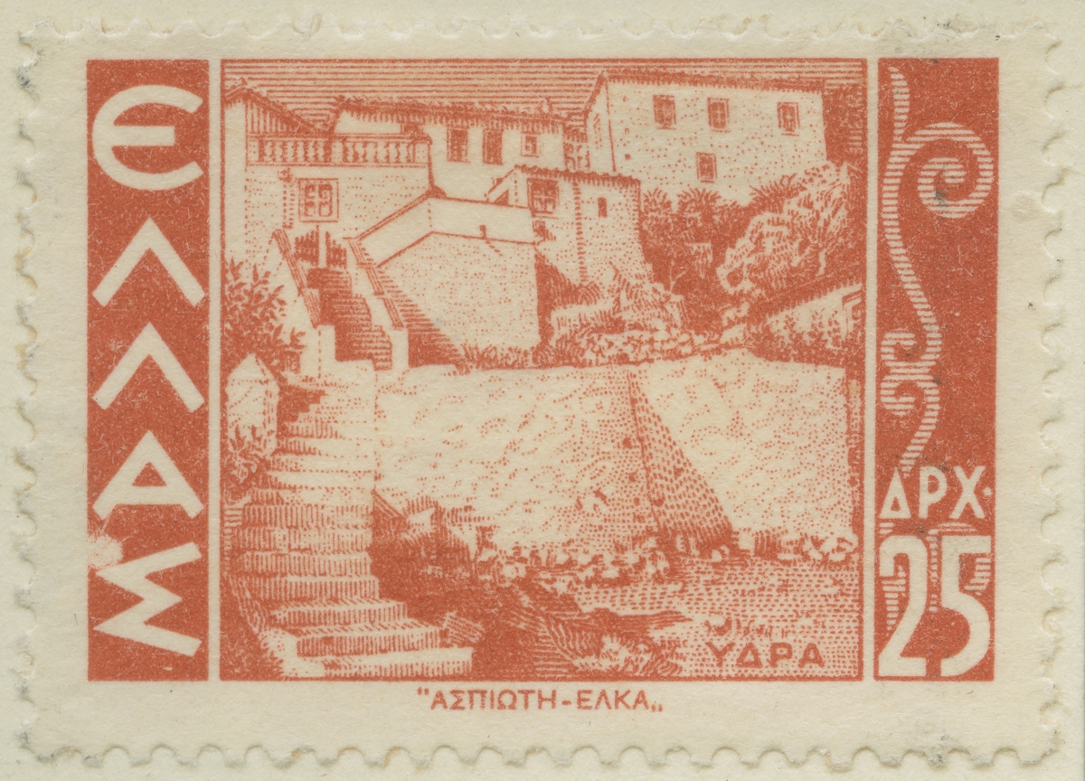 Frimärke från Grekland, 1942. Motiv av byggnader på ön Hydra.