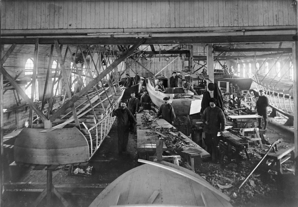 Varvsinteriör. Vid den här tiden var salongsbåten en etablerad typ, men de snabbare båtarna med v-botten under utveckling. Här byggs några "salongsracerkryssare av V-typ"!
