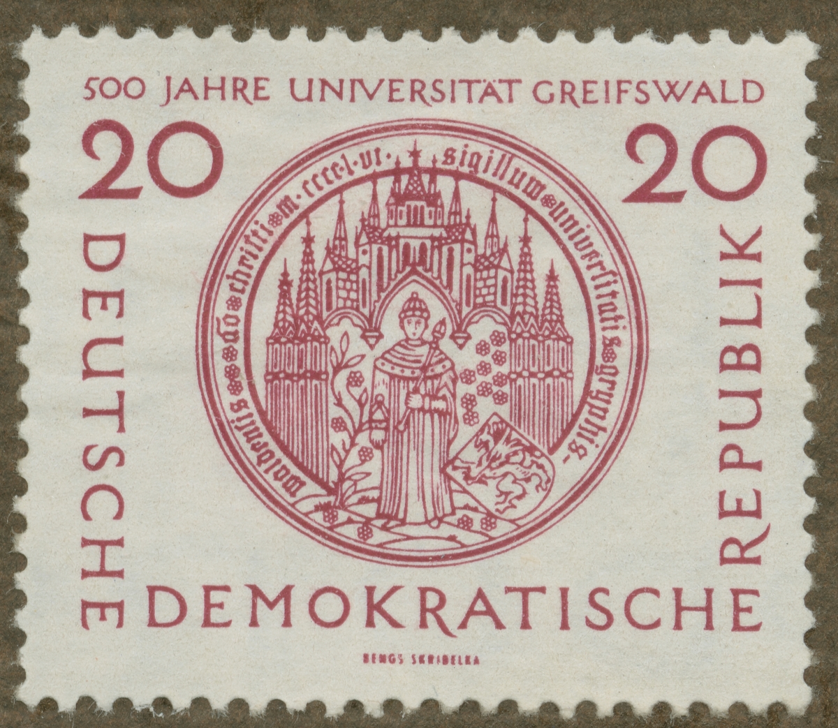 Frimärke från Östtyskland, 1956. Motiv av kyrktorn och vapen. "Greifswalds Universitet 500 år".