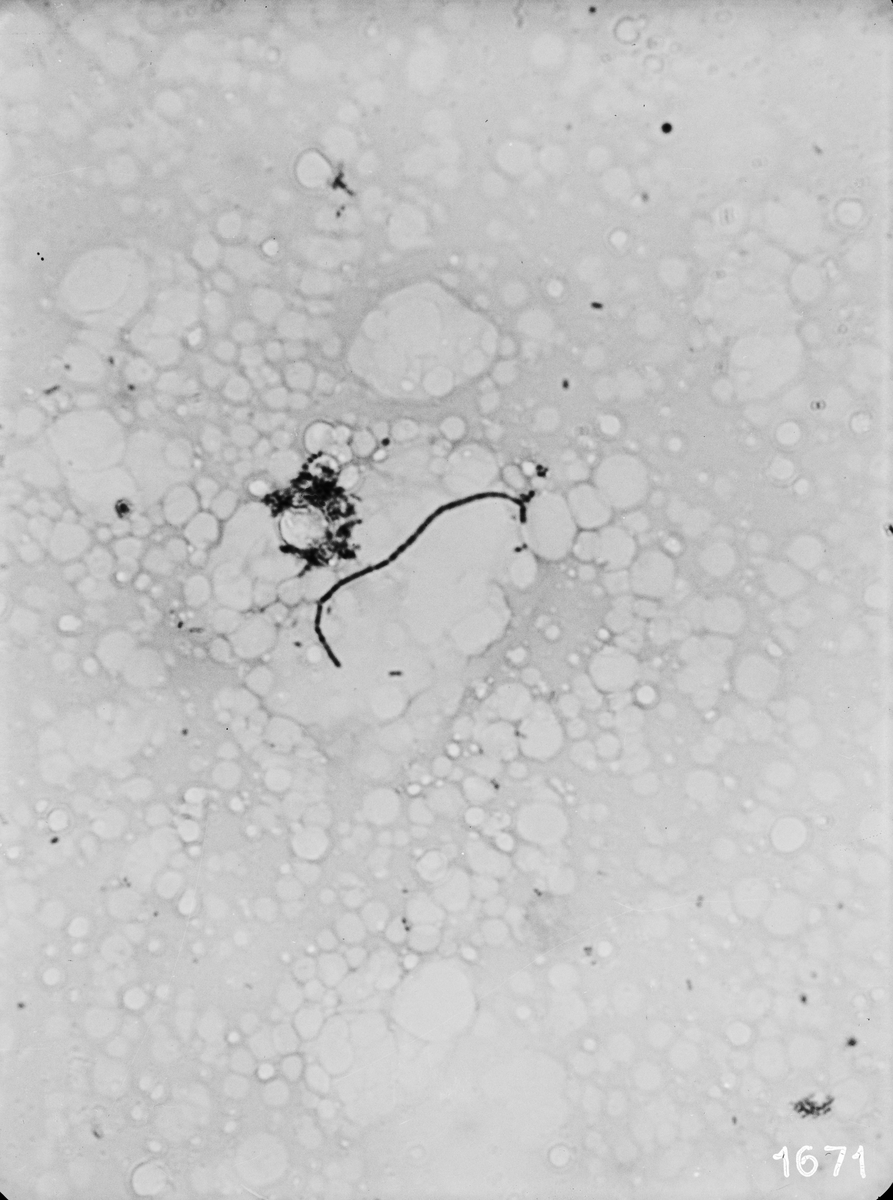 Mikrofotografering av mjölk. Mjölk förvarad 1 dygn i 20°C. Prov nr. 44.