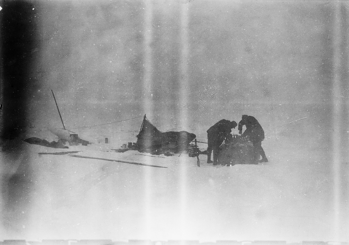 Titel: Lägret brytes. Till höger Andrée och Fraenkel vid den upp -och nedvända båten. Freankel var den starkast av de tre och han drog också den tyngsta bördan. Senare blev han på grund av fotbölden oförmögen att släpa sin kälke. Framtagning av bilderna gjordes av docent John Hertzberg år 1930 på Fotografi, Tekniska Högskolan.