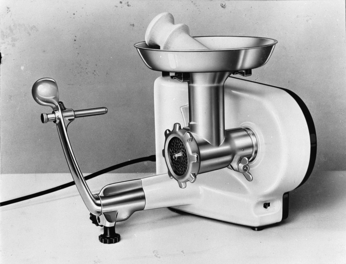 Blandningsmaskin "assistent" i det vanligaste användningsfallet (blandning, degknådning och vispning). Första expewrimentmodellen konstruerad år 1938. Monterad för malning.