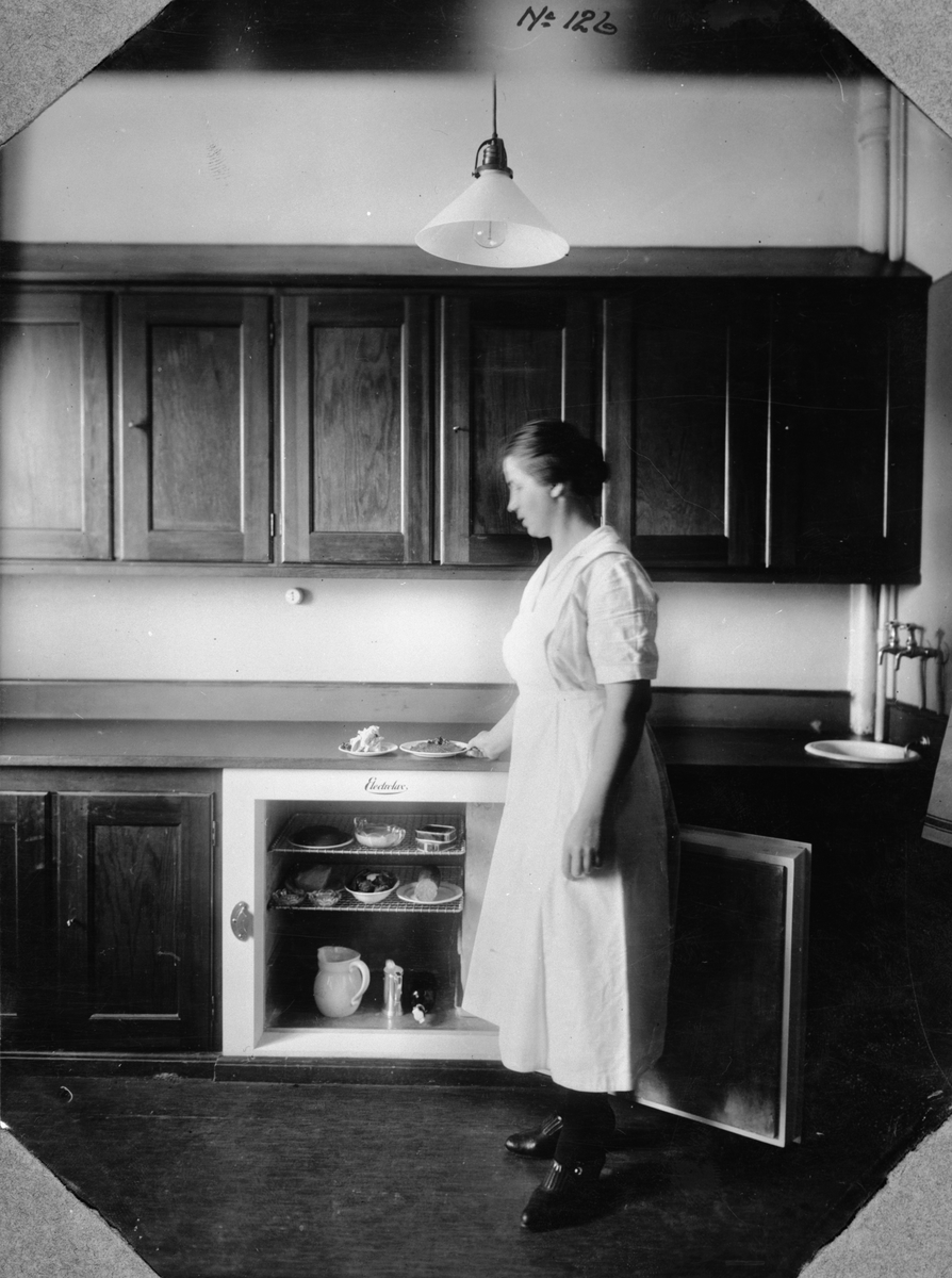Bänkkylskåp, öppet. Kvinnlig demonstratör.