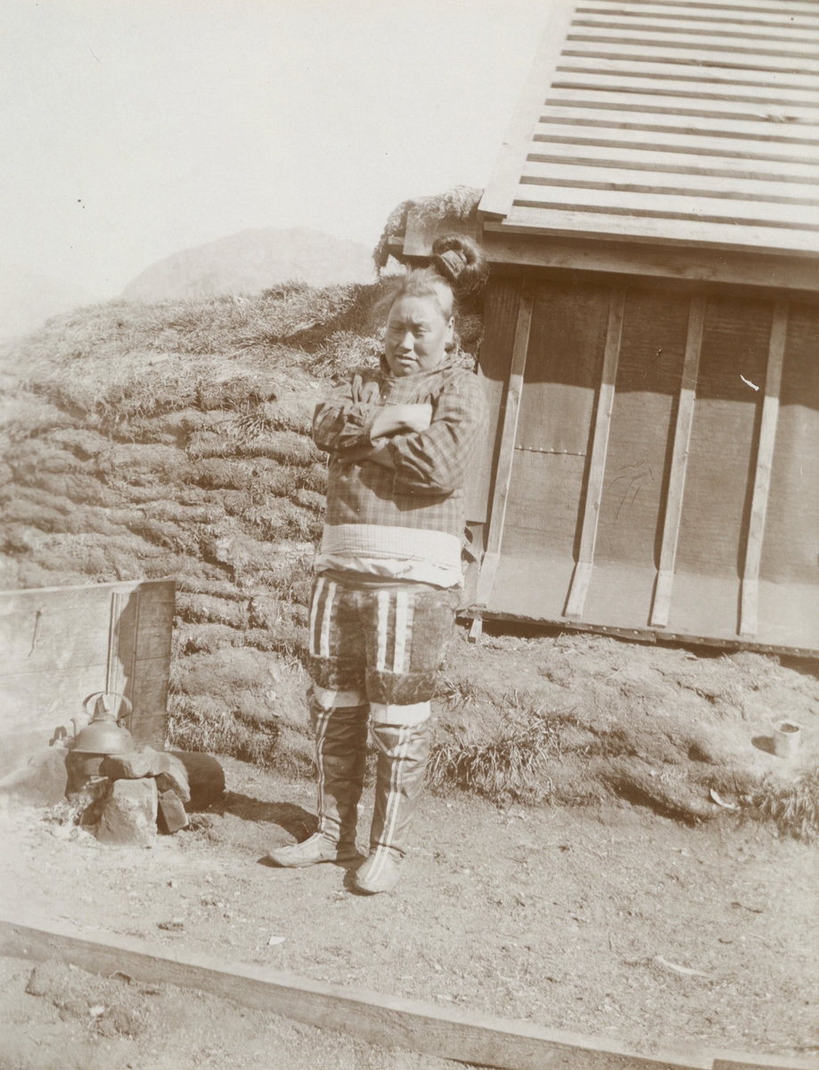 Fotografi från expedition till Grönland. Motiv av kvinna som står med armarna i kors utanför ett hus.