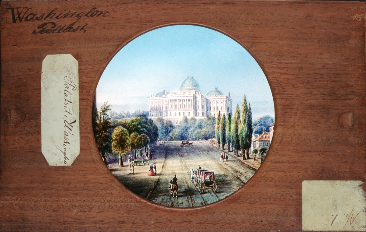 "Palatset i Washington", detaljrikt målat. I förgrunden människor och hästdroskor.