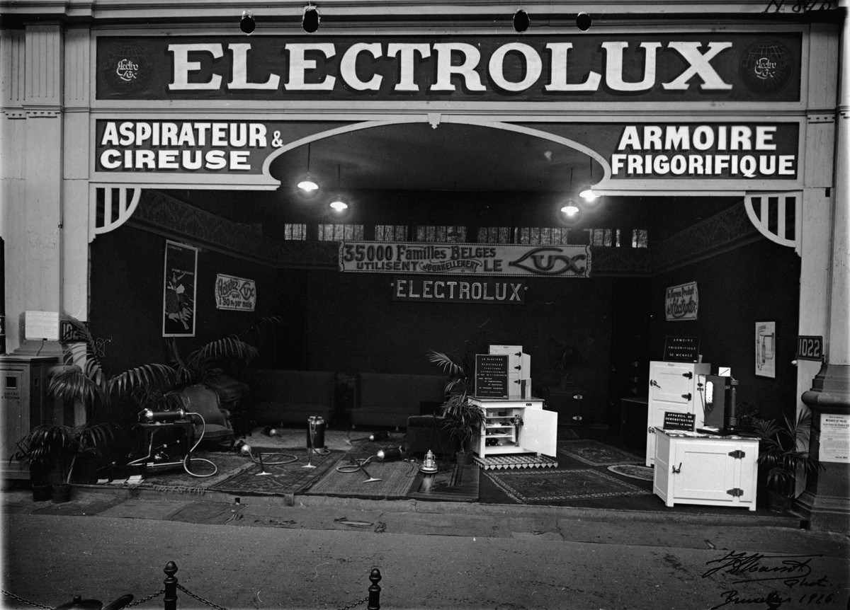 Electrolux utställning i Bryssel, Belgien. Interiör. Bänkkylskåpsmodell, hög kylskåpsmodell, generator? och dammsugare.