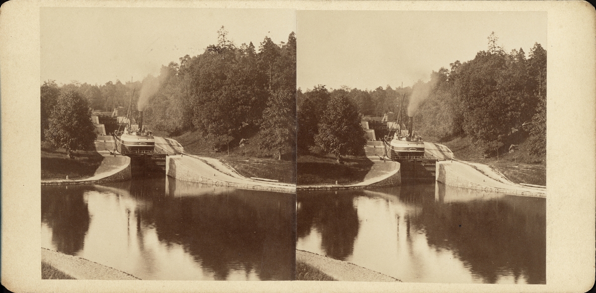Stereobild av båt påväg genom slussen i Trollhättan, Göta Älv.