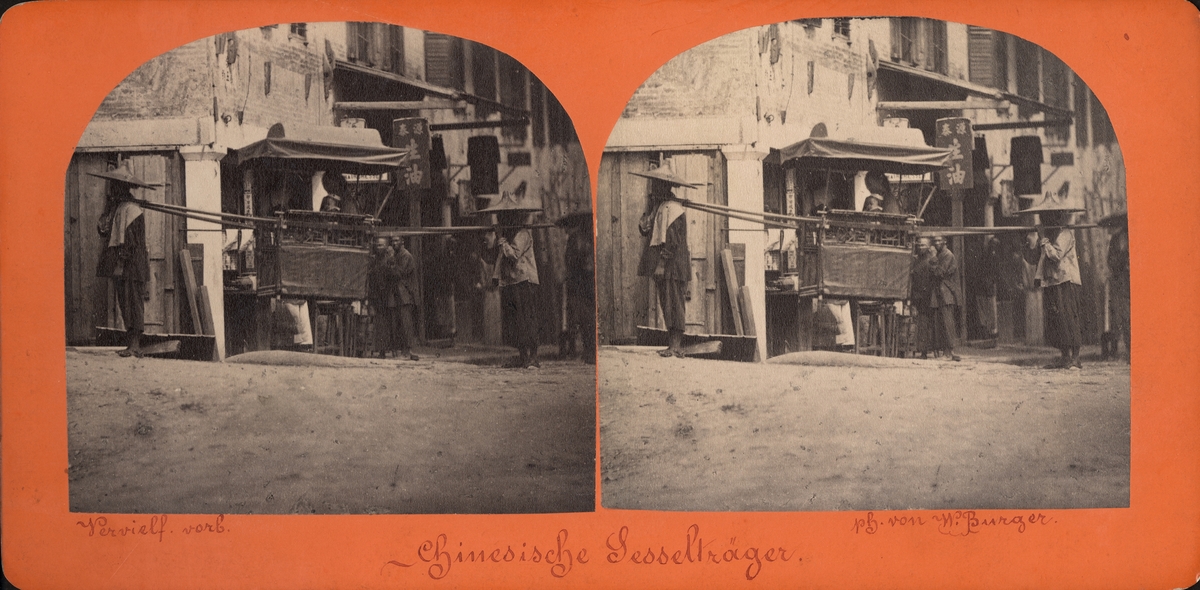 Stereobild av två män som bär kvinna och barn i bärkorg på gata i Kina.