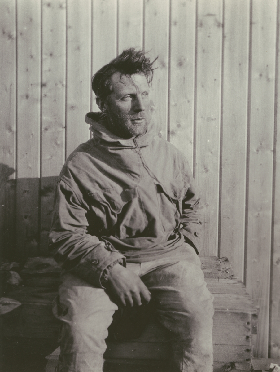 Fotografi från Ahlmannexpeditionen 1931. Porträtt av den norske topografen Olav Staxrud som sitter framför trähus.