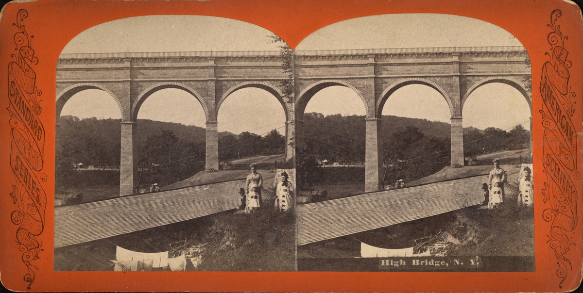 Stereobild, två kvinnor med två barn vid High Bridge, N.Y.