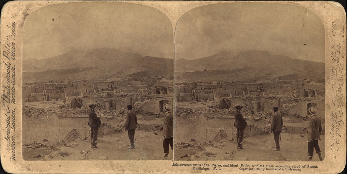 Stereobild av Mont Pelée vulkanen och den av vulkanen utplånade staden St. Pierre.