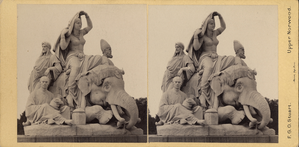Stereobild av staty/ skulptur med indisk kvinna sittande på liggande elefant med tre olika män invid.