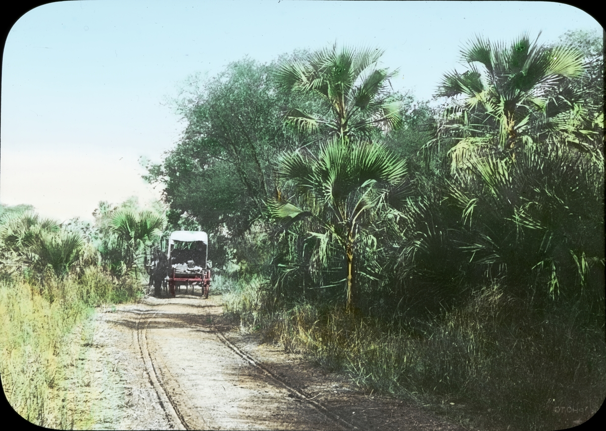 Kolorerad ljusbild med motiv av ekipage på väg i djungeln.