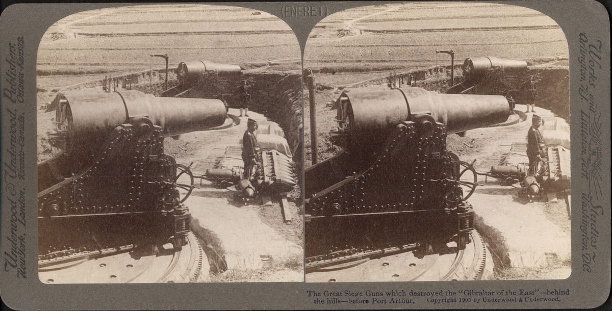 Stereobild av de stora bombvapnen vilka förstörde "Gibraltar of the East", bakom kullarna, invid Port Arthur.