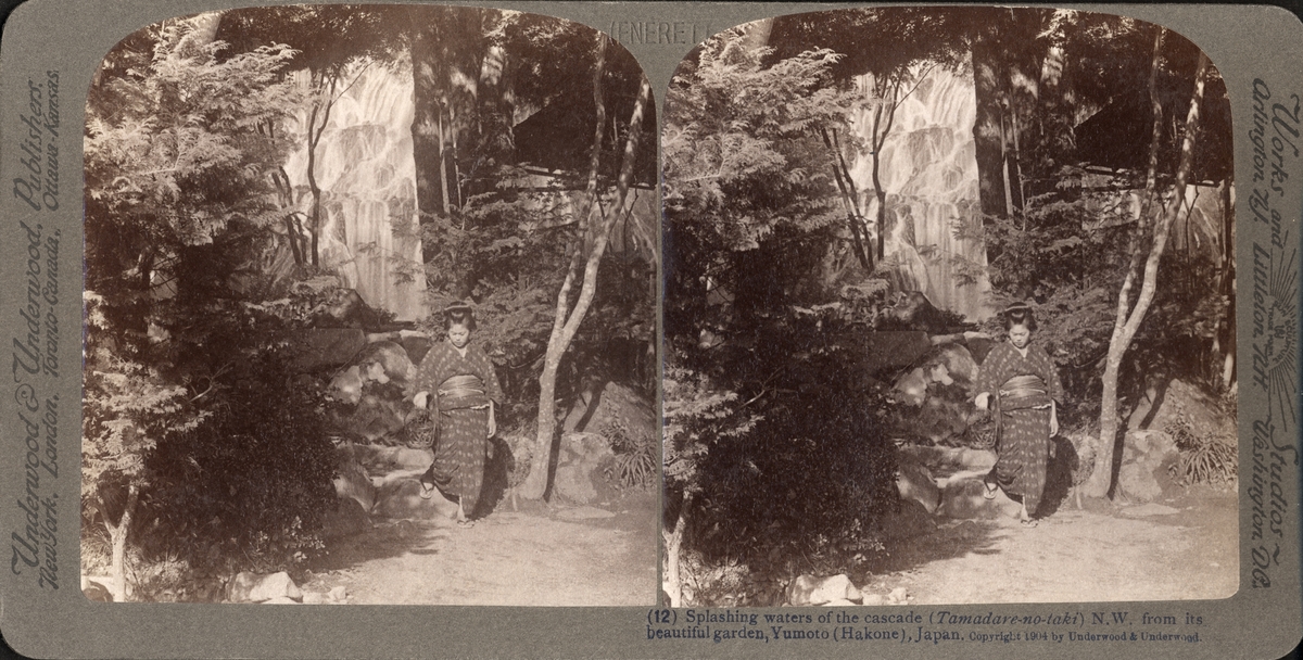Stereobild av japansk kvinna framför vattenfallet Tamadare-no-taki, de varma källorna Yumoto i Fuji-Hakone- Izu National Park, Japan.