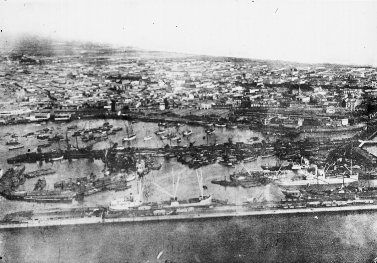 Ljusbild, vy över hamnstad, hamn med båtar.